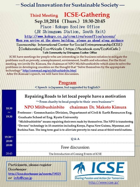 International Center for Social Entrepreneurship (ICSE) was founded in March, 2010 for the goal of supporting those individuals who wish to contribute to solving social issues through social innovations. ICSE is a spin-off of the Social Entrepreneurship Program at Tokyo Institute of Technology (Tokyo Tech), which had been implemented from April of 2006 to March of 2010.